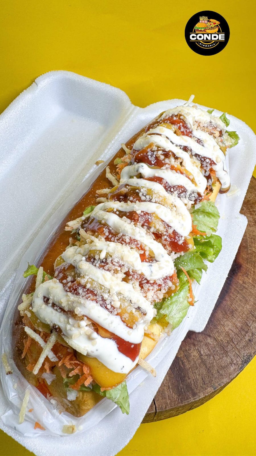 pão de 20cm, salsicha, carne moida, tomate, cebola, alface, cenoura, maionese, catchup, queijo ralado, batata palha.R$ 11,99