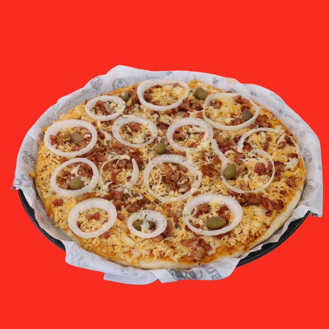 Massa, molho, Mussarela, frango, bacon, tomate e cebolaR$ 42,99