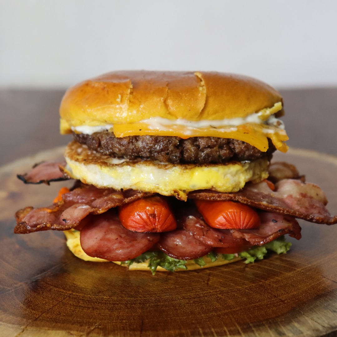 Pão, carne artesanal, queijo, presunto, ovo, bacon, salsicha, calabresa, salada, creme especialR$ 26,99
